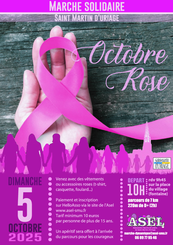 Dans le cadre de la campagne « Octobre Rose », rejoignez-nous pour cette nouvelle édition de notre marche solidaire en faveur de l’association RUBAN ROSE !